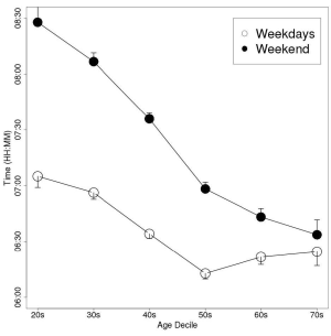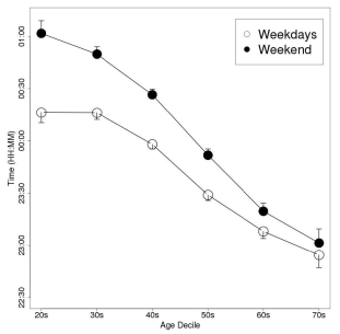 今回は手始めに、平日(日〜木)と週末(金・土)の睡眠パターン(就床・起床)の変化を解析しました。その結果、若い世代ほど、就床時刻(左図)、起床時刻(右図)の平日と週末での差が大きいことが示されました。このような傾向は、以前から考えられていたものですが、客観的データで定量的に示した点で価値が高い研究です。