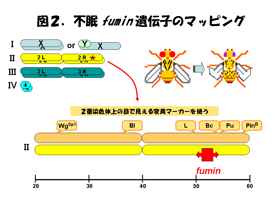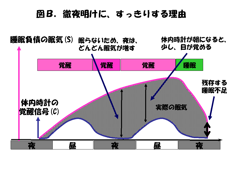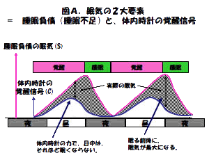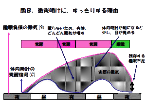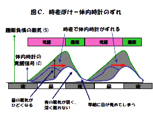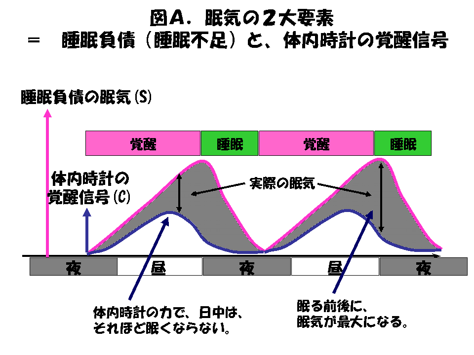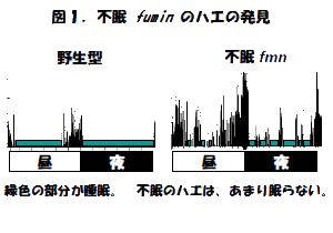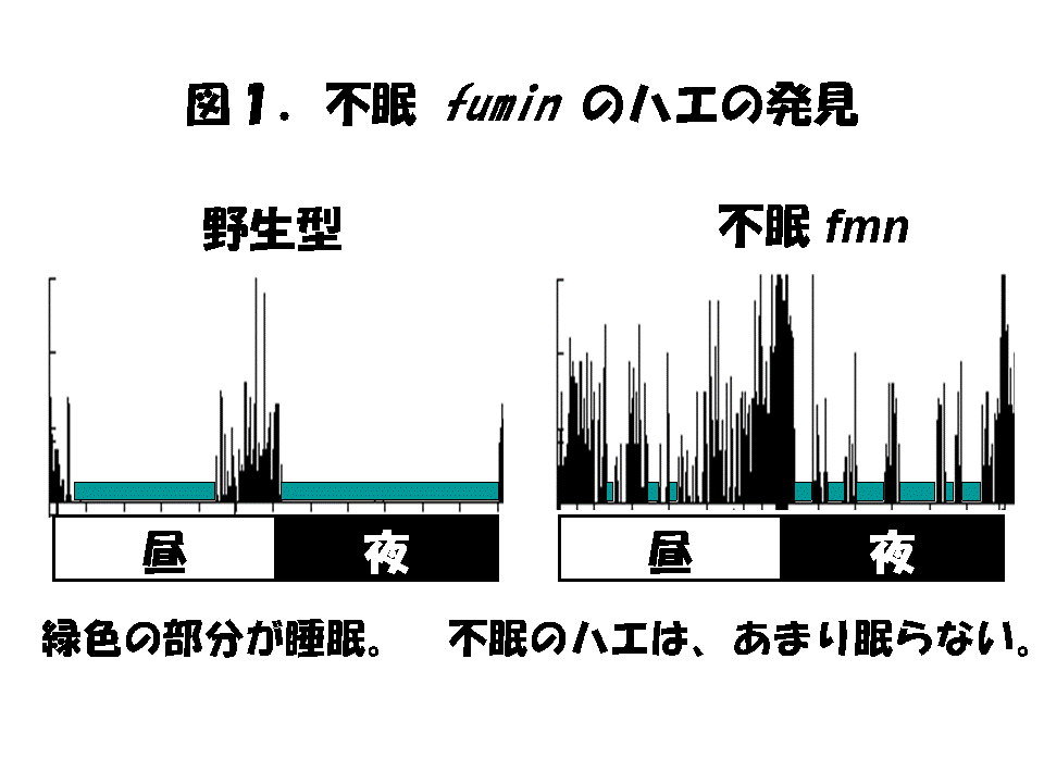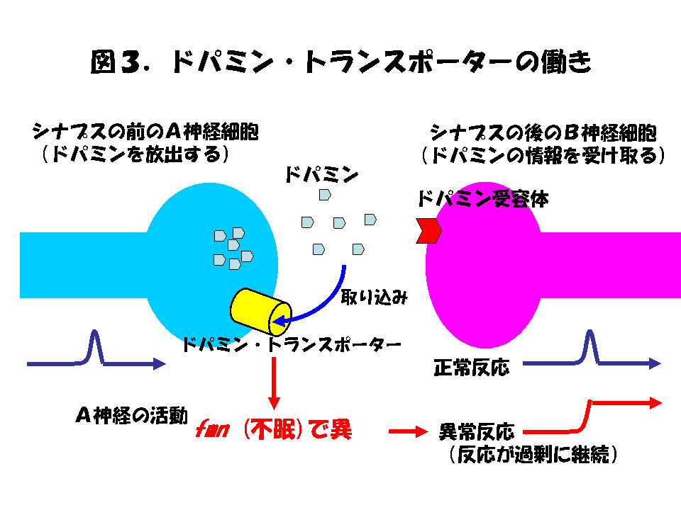 【補足】 1.睡眠と体内時計の関係 睡眠は、眠気によって、その量(長さ)と質(深さ)を、調整されています。私たちは眠くなると眠り、眠くない時は眠れません。この眠気は、まず睡眠そのものホメオスターシス制御により、その量が決まります。ずっと起きていると、だんだん眠気が貯まってきます、そして、眠ると眠気が解消されます。 これに加えて、眠気は、体内時計(概日周期)の影響も受けます。つまり、体内時計が昼の間は、眠気を覚ます信号、つまり覚醒信号を送るため、眠気が弱まります。そのため、日中は、比較的眠気が弱く、夕方以後、急速に眠気が強くなるとされています。(補足図A) このことは、徹夜明けの翌朝に、眠っていないのにすっきり目が覚めた感じがする時間があることや、時差ボケなどで、私たちも、日常で体験します。(補足図B,C) 2.体内時計の遺伝子 24時間周期の生物現象は、動物にも植物にも広く見られますが、それを制御する遺伝子が、1990年代末に解明されました。その結果、ショウジョウバエでも、人間でも、ピリオドという同じ遺伝子が、概日周期を刻む体内時計のふりこに当たる重要な役割をしていることがわかりました。 3.ドパミン・トランスポーターの働き ドパミンは、二つの神経細胞の間で情報を伝える神経伝達物質のひとつで、ある神経細胞(図3のA神経細胞)が、活動すると、その活動に応じてシナプスと呼ばれる場所で放出されます。そして、この放出されたドパミンは、次の神経細胞(B神経細胞)の受容体に結合して、その神経細胞を活動させます。ドパミン・トランスポーターは、A神経細胞側に存在して、一度、放出されたドパミンを、再びA神経細胞に取り込むことにより、この活動を終結させます。コカインなどの覚醒物質は、このドパミン・トランスポーターに結合して、取り込みをさせなくしてしまいます。そのため、一度、ドパミンが放出されると、シナプス部に、ドパミンが長く留まることにより、B神経の活動が、普通より長く続いてしまいます。このことが、覚醒につながると考えられます。 ショウジョウバエのfmn(不眠)変異では、このトランスポーターの遺伝子が異常を起こして、トランスポーターがなくなってしまっているため、ドパミンの作用が、とても強まり、覚醒剤を飲んだ時と、同じような状態になっていると考えられます。
