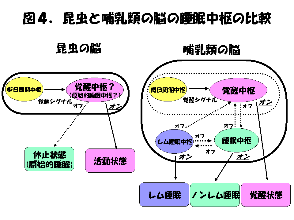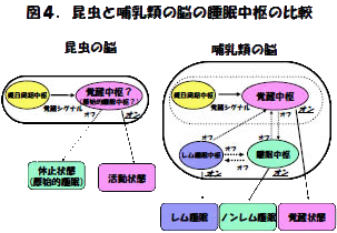 熊本大学発生医学研究センター 粂 和彦 この文書のPDFファイル版は、 こちらです(http://k-net.org/science/fmn.pdf) 【概要】 ショウジョウバエは、1日の70%程度の時間を、じっと動かない状態で過ごす。これが、ハエの睡眠と考えられている。この睡眠時間が極端に減少したハエを見つけ、その原因が、ドパミン・トランスポーター遺伝子の異常であることを発見した。このことは、昆虫の睡眠覚醒制御に、哺乳類と同じ物質と遺伝子が使われていることを、初めて示した。 この成果は、熊本大学と米国のタフツ大学、バージニア大学の共同研究として、2005年8月10日発刊の、米国神経科学会誌に発表した。 Dopamine is a regulator of arousal in the fruit fly. Kazuhiko Kume, Shoen Kume, Sang Ki Park, Jay Hirsh and F. Rob Jackson Journal of Neuroscience 25: 7377-7384, 2005 本論文のPDFファイルはこちら(http://k-net.org/science/JNS2005.pdf) 【今回の発見の意義】 この発見の意義は、ショウジョウバエと人間という、種として離れた動物の間で、覚醒制御に同じ物質と同じ遺伝子が使われていることを証明したことです。 ハエもヒトも、ドパミンという物質を覚醒制御に用いており、その量を低く調節している遺伝子(ドパミン・トランスポーター)の働きをダメにすると、 眠らなくなることがわかりました。 覚醒物質のコカインや、アンフェタミンも、このトランスポーターを抑えてしまうことで、目を覚まさせます。 以前から、哺乳類だけではなく、魚や、虫も、「睡眠に似た行動」をすることは知られていましたが、その制御が遺伝子レベルでも似ていたため、 覚醒睡眠制御の原型がハエとヒトの間で、進化的に保存されていることがわかりました。 つまり、この2種類の動物が進化的に分離した数億年前まで、睡眠覚醒行動のルーツ、そして、その生物学的意義も さかのぼれる可能性があります。 【研究内容の詳細】 1.従来の研究で、睡眠が体内時計に制御されていること(補足1)、 体内時計の遺伝子が哺乳類と昆虫で保存されていること(補足2)、が示されていました。 しかし、覚醒維持は意識という、ヒトの脳の機能の中でも、最高次の機能の基本部分で、その制御機構は、高等動物にしかない可能性もありました。 また、人間の睡眠を特徴づけている、レム睡眠とノンレム睡眠の2種類の睡眠は、鳥類と、ごく一部の爬虫類にあるだけで、同じ脊椎動物でも両生類、魚類にはないとされています。 当然、無脊椎動物である昆虫には、存在しません。 2.ところが、昆虫などの下等生物においても、「睡眠に似た静止行動」が存在することが、示されてきました。 この静止行動は、概日周期による制御、恒常性の制御、覚醒域値の上昇という、行動学的に睡眠との類似性が高いことが知られていました。 そこで、私たちは、遺伝学的手法に優れ、概日周期の遺伝子がほぼ解明されているショウジョウバエを用いて、この睡眠類似行動を解析していました。 3.その過程で、普通のハエが、1日の70%程度の時間を、じっと動かない状態で過ごすのに対して、この静止時間が3分の1から、5分の1程度に減ったハエを2001年に偶然見つけ、解析を行ってきました(図1.不眠のハエの発見)。その結果、このハエは、起きている時間当たりの動く量は、普通のハエと変らないが、起きている時間が3〜5倍長いため、1日当たりの活動量は、3〜5倍に増えていること、また、じっとしている時間帯でも、覚醒域値が低下していることなどを見出しました。 4.さらに組み換えを用いた解析から、このハエの異常が、ドパミン・トランスポーター遺伝子の異常によることをつきとめました(図2.不眠の遺伝子のマッピング)。このドパミン・トランスポーターは、ドパミンの量を、一定以下に調節する役割を持ちます(図3.ドパミン・トランスポーター、補足3)。覚醒物質のコカインや、アンフェタミンが、このトランスポーターの働きを抑えてしまうことで、目を覚まさせることからわかるように、人間でも、このトランスポーターが、覚醒制御に重要な役割をしています。 5.ショウジョウバエの行動静止が、睡眠と類似していることは、2000年に、米国の二つのグループから発表され、さらに、2005年の3月には、Shaker という遺伝子の異常が、ハエの睡眠類似行動に異常を来たすことが示されていました。また、私たちの発表の直前の2005年7月に、別のグループが、薬理学的な研究を用いて、ドパミンがハエでも覚醒制御に関係する可能性を示しました。しかし、哺乳類でも覚醒制御に重要な遺伝子と同じ遺伝子(ドパミン・トランスポーター)が、ハエの睡眠覚醒制御に使われていることを示した点で、今回の発見は、画期的です。 6.このことから、概日周期生物時計(体内時計)の中枢と、睡眠覚醒制御の一次中枢は、昆虫の脳と、哺乳類の脳で、原型が保たれている可能性が強まりました。(図4.昆虫と哺乳類の脳の比較) 今後、この遺伝子とドパミンの働きをさらに解析することにより、概日周期制御と睡眠覚醒制御との関係や、